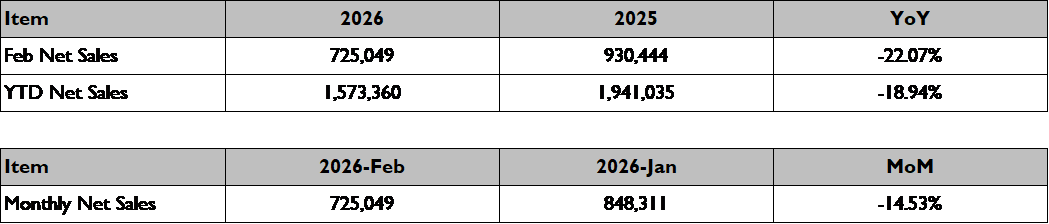Revenue for February 2026 was NT$725 million, decreased 15% month-over-month and 22% year-over-year.