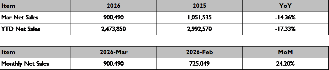 FocalTech Monthly Consolidated Sales Report for March 2026