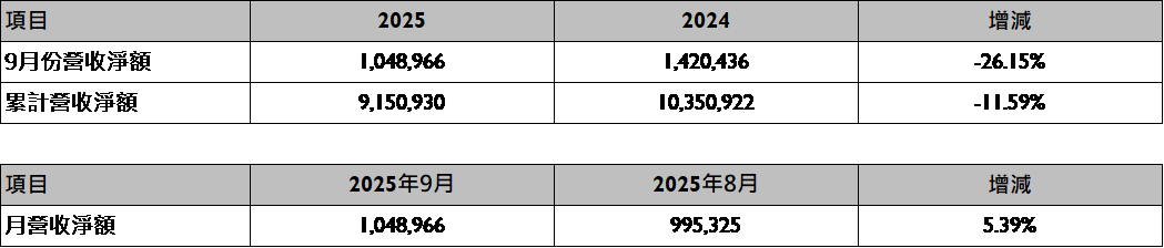 敦泰电子股份有限公司今(09)日公布2025年9月营收报告。2025年9月份合并营收为新台币10亿4仟9佰万元,较2025年8月份增加5%,与去年同期相比减少26%。