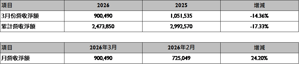 敦泰电子股份有限公司今(09)日公布2026年3月营收报告。2026年3月份合并营收为新台币9亿元,较2026年2月份增加24.2%,与去年同期相比减少14.36%。