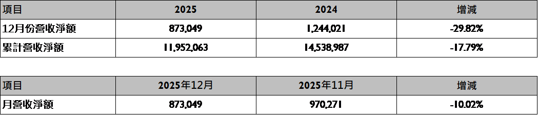 敦泰電子股份有限公司今(09)日公佈2025年12月營收報告。2025年12月份合併營收為新台幣8億7仟萬元,較2025年11月份減少10%,與去年同期相比減少30%。