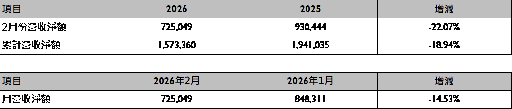 敦泰電子2026年2月份合併營收報告