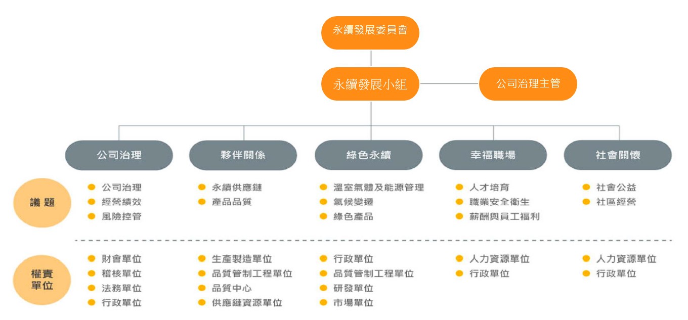 董事會亦於2018年4月24日通過成立公司治理小組,建立推動永續發展之治理架構,且設置推動永續發展專(兼)職單位綜理公司治理、永續事項和企業社會責任的計劃及工作推動;為更進一步落實ESG,已更名為"永續發展小組"。並由永續發展小組與公司相關單位共同研議計劃及執行方式,每年由公司治理主管暨董事會執行祕書將年度計劃及執行情形呈報於董事會, 由董事會授權及督導相關事項。